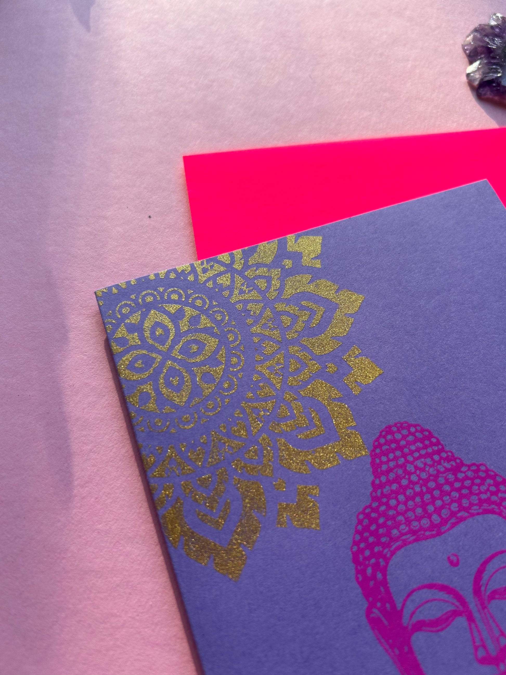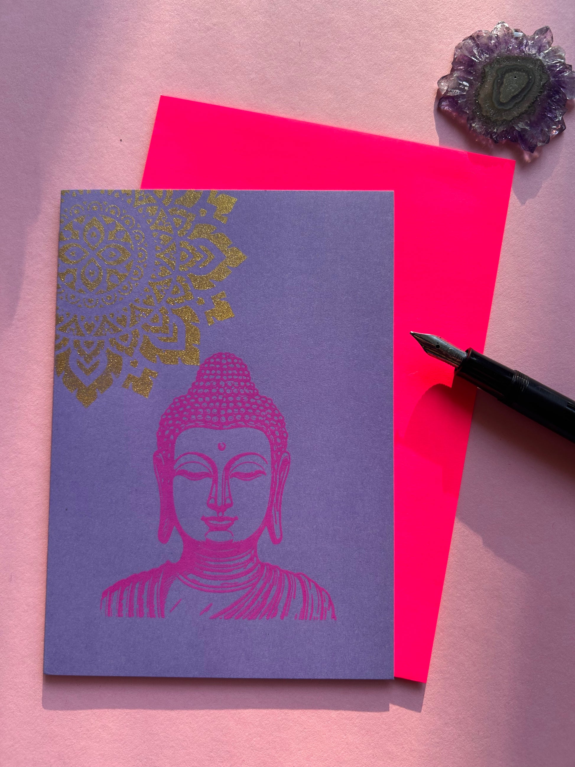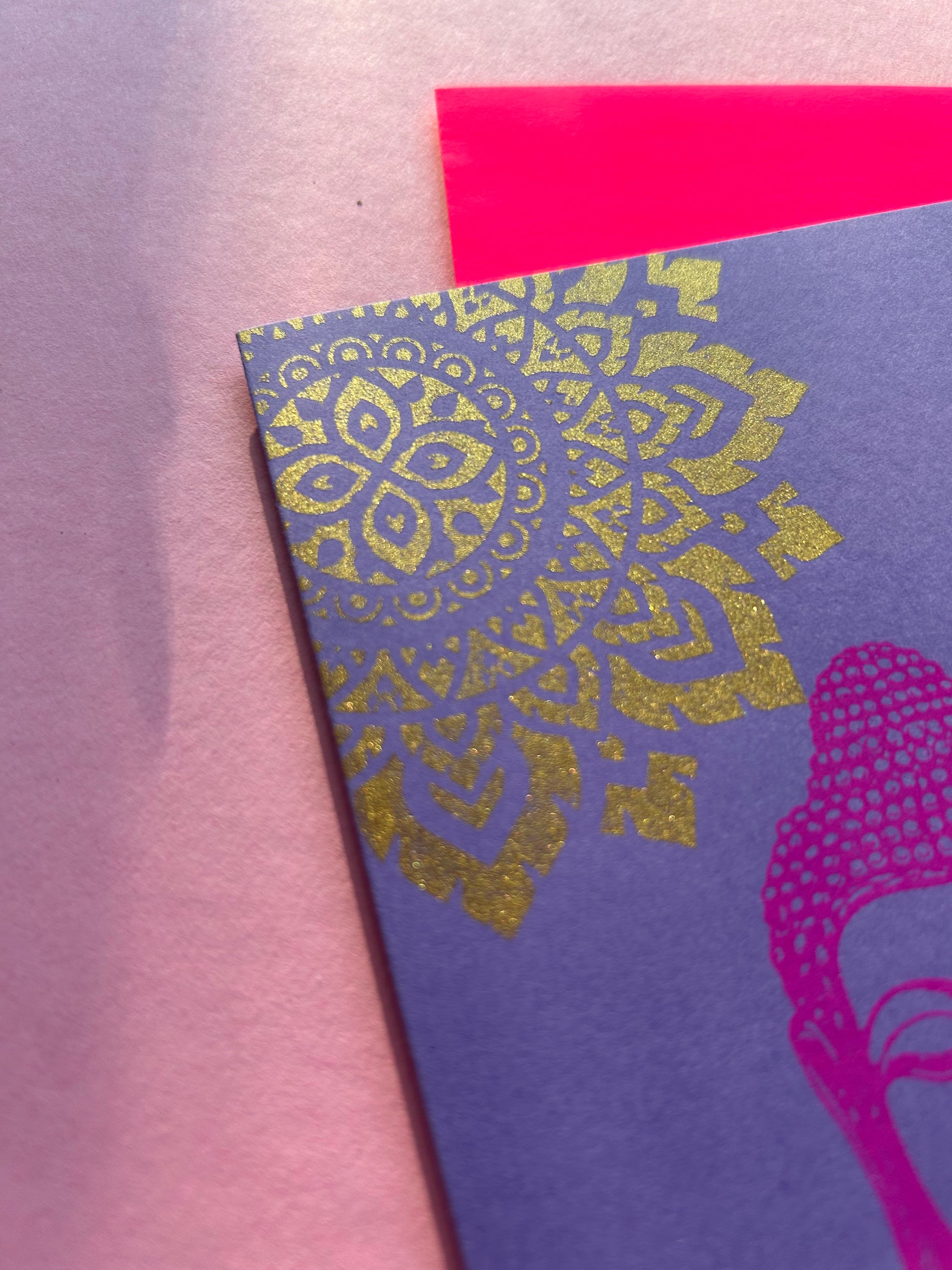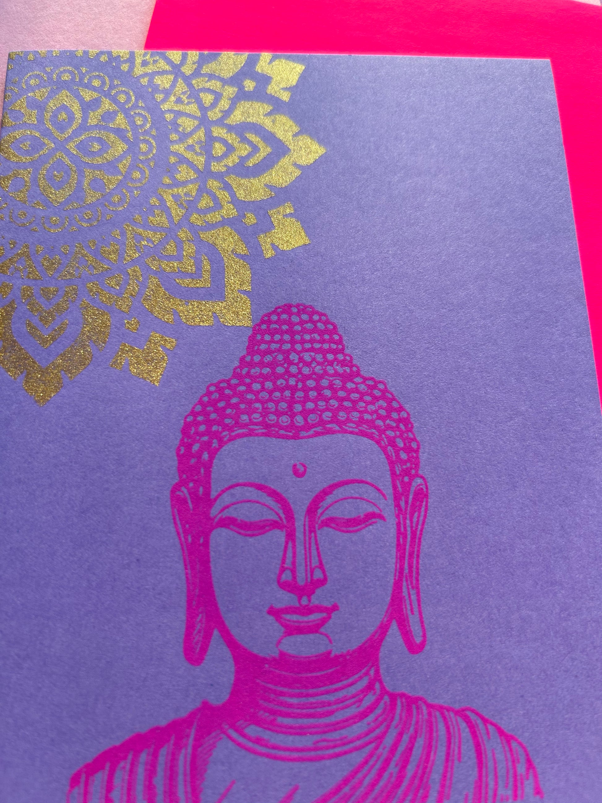 Die Kombination aus sanftem Lila, goldenem Mandala und dem leuchtend neonpinken Umschlag macht die Karte zu einem strahlenden Hingucker – ideal zum Verschenken, Inspirieren oder Behalten.